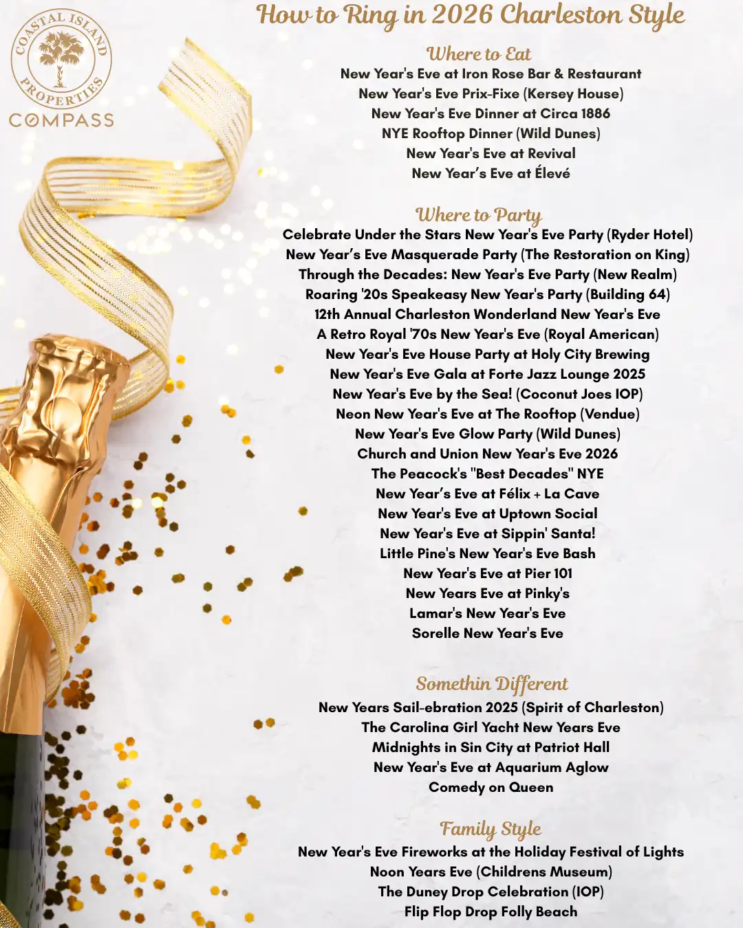 New Year’s Eve is almost here, and Charleston is bringing the options. From festive dinners and fireworks to themed parties and family-friendly fun, the Lowcountry offers countless ways to ring in the New Year. Whether you’re planning a big night out or something a little more low-key, there’s no shortage of celebrations happening around town.
