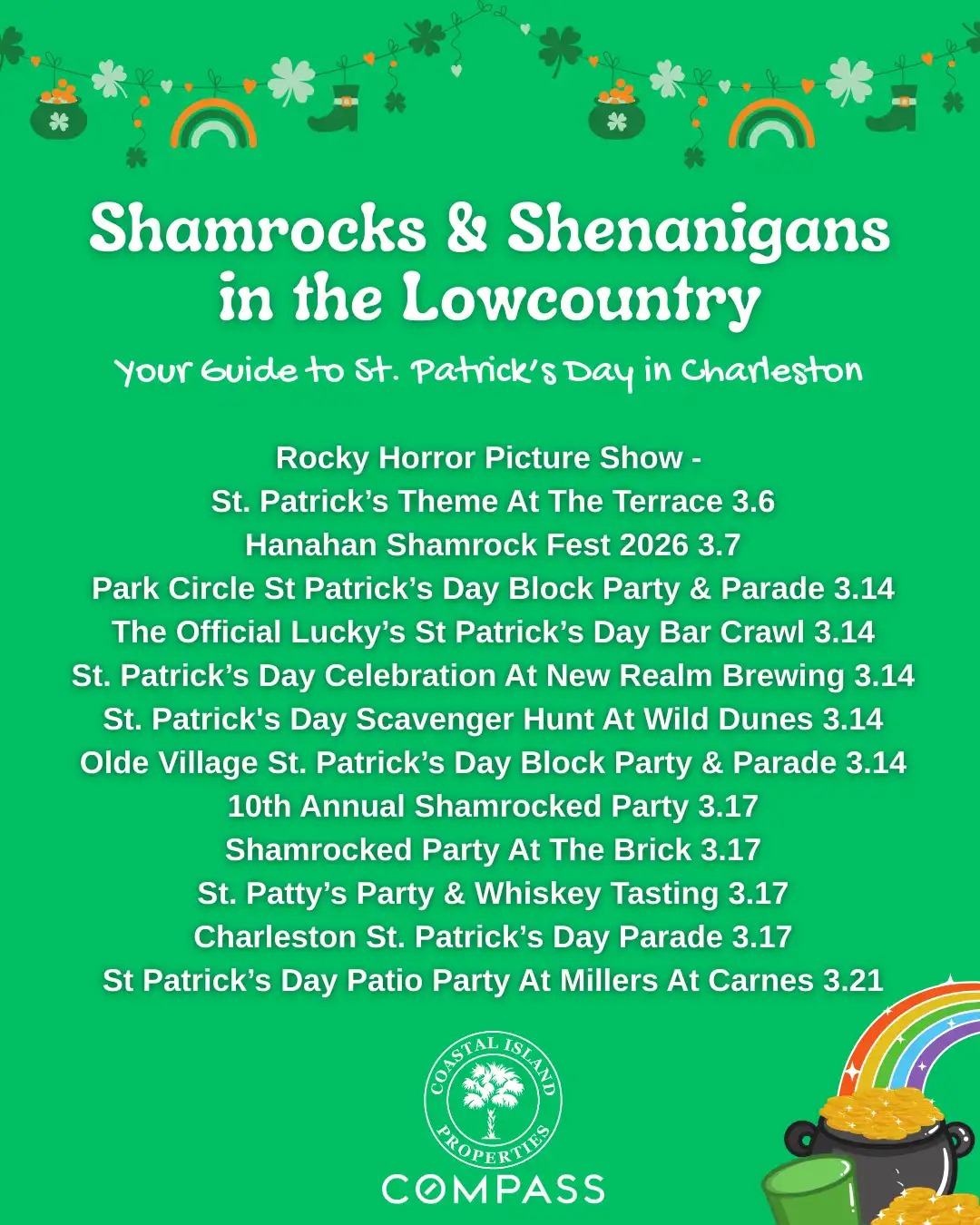 Today, the celebration has grown well beyond the parade. From the Park Circle St. Patrick’s Day Block Party & Parade to brewery parties, bar crawls, and festive community events, there are plenty of ways to join the fun around the Lowcountry. Whether you’re planning to grab a pint with friends, enjoy a parade downtown, or check out one of the many themed events happening across Charleston, this week is full of shamrocks, celebrations, and a little Lowcountry luck. 🍀