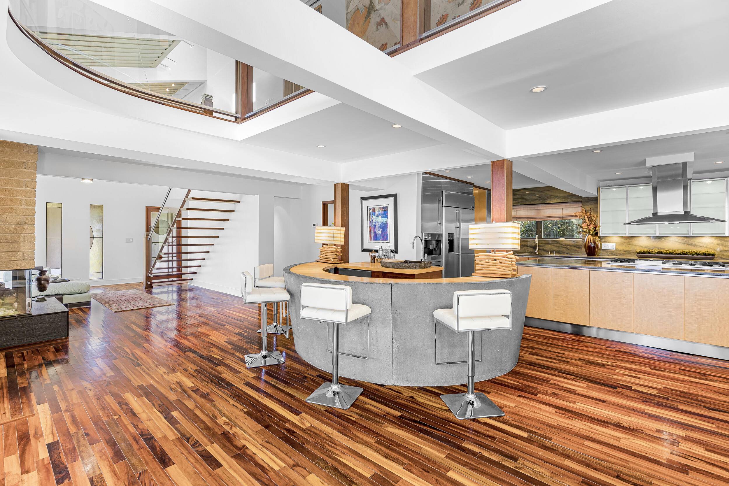 At the heart of the home, the open-concept living room is equal parts statement and retreat. Anchored by a custom terrazzo concrete bar and a sleek gas fireplace, it is a space designed for both quiet reflection and vibrant entertaining. The kitchen continues the narrative of understated luxury, appointed with GE Monogram refrigeration, Thermador double ovens, a warming drawer, a built-in Miele coffee station, and a Sub-Zero wine fridge.