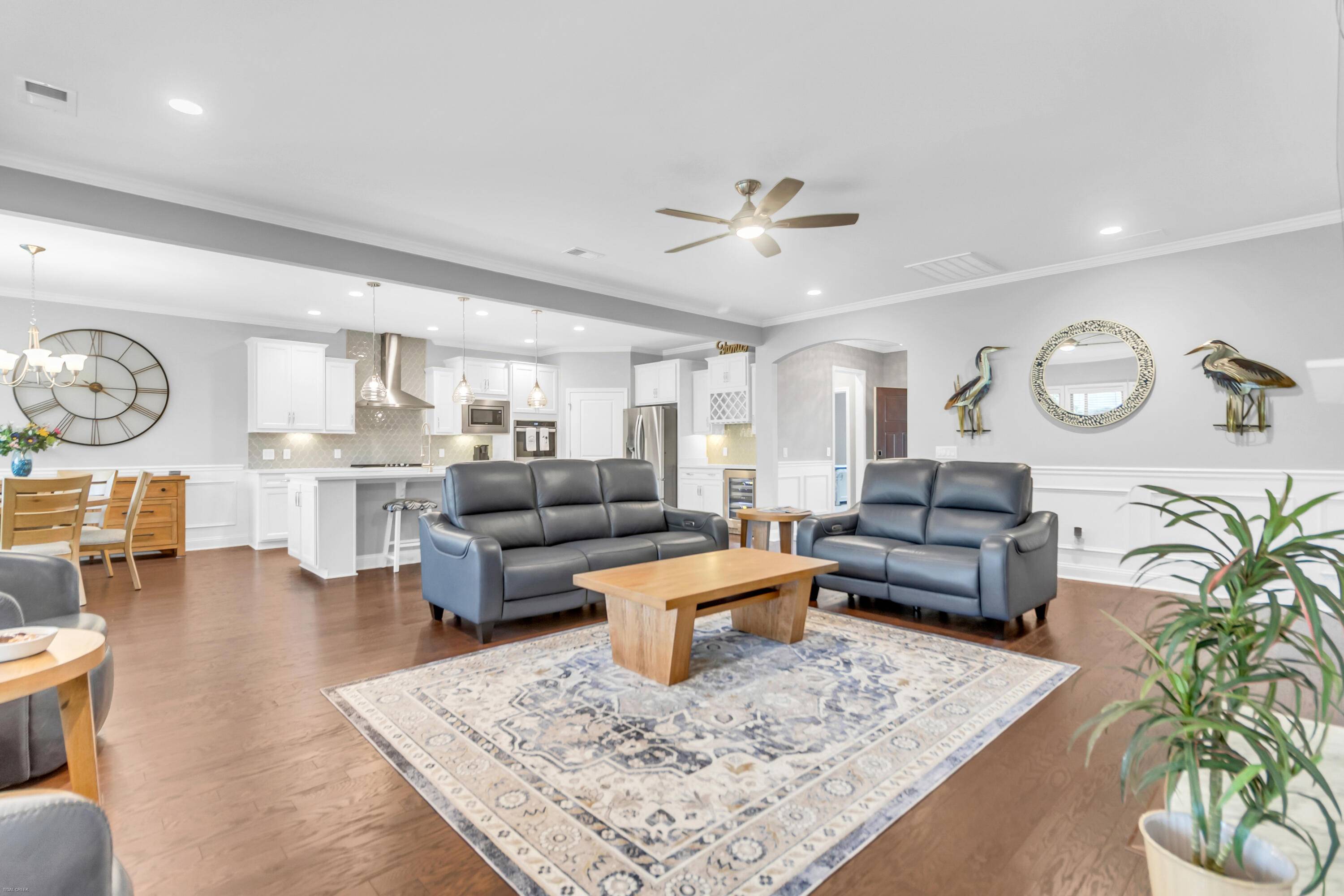 Discover effortless Lowcountry single-story living in Nexton. Why wait to build or pay for upgrades when this home already has it ALL! Wainscoating, Crown molding, Gourmet Kitchen, Wine Bar with Refrigerator, Gas Fireplace, Deluxe Owner's Bath, Custom drop zone, Utility sink in laundry room, 3 car garage, Marble and wood flooring. Best of all, the porch was recently customized to a 4 SEASON'S ROOM with sliding glass doors and a mini-split AC system. Did I mention the water purification system? There is so much to love!Inside, light pours through a wall of windows onto the elegant details you have always wanted and expected. you and friends will make many happy memories in this fantastic home! Come see for yourself!The owner's suite is a sanctuary with its serene sitting area and spa-like bath, while a private office and custom drop-zone add daily ease. Step beyond to the extended porch, thoughtfully converted with mini splits for year-round comfort, opening to a patio designed for relaxed evenings under the Carolina sky. The patio is glassed in with new slider windows.